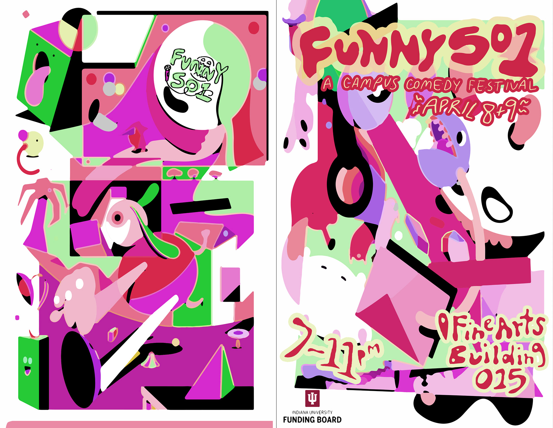 Program for Indiana University's Funny 501 comedy festival. An abstract and loose design for the front and back covers and simple and readable inside pages were just some of the challenges tackled in this design.