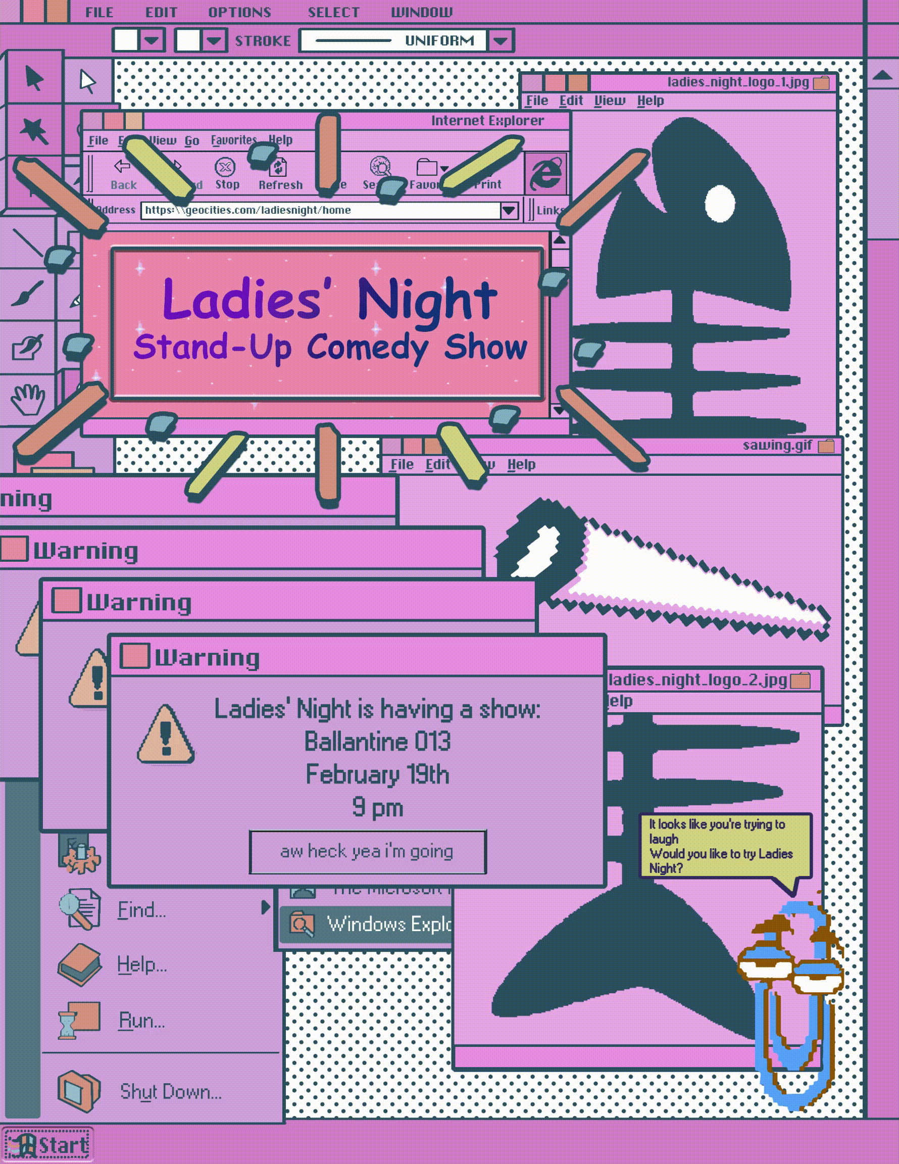 A commissioned digital poster for Indiana University's all-female stand-up group "Ladies' Night." The client asked for a 90's computer/internet aesthetic with a cutesy, cluttered look. Designing this poster struck a balance between visual focus and small detail. The animated touches were also a unique and fun addition.