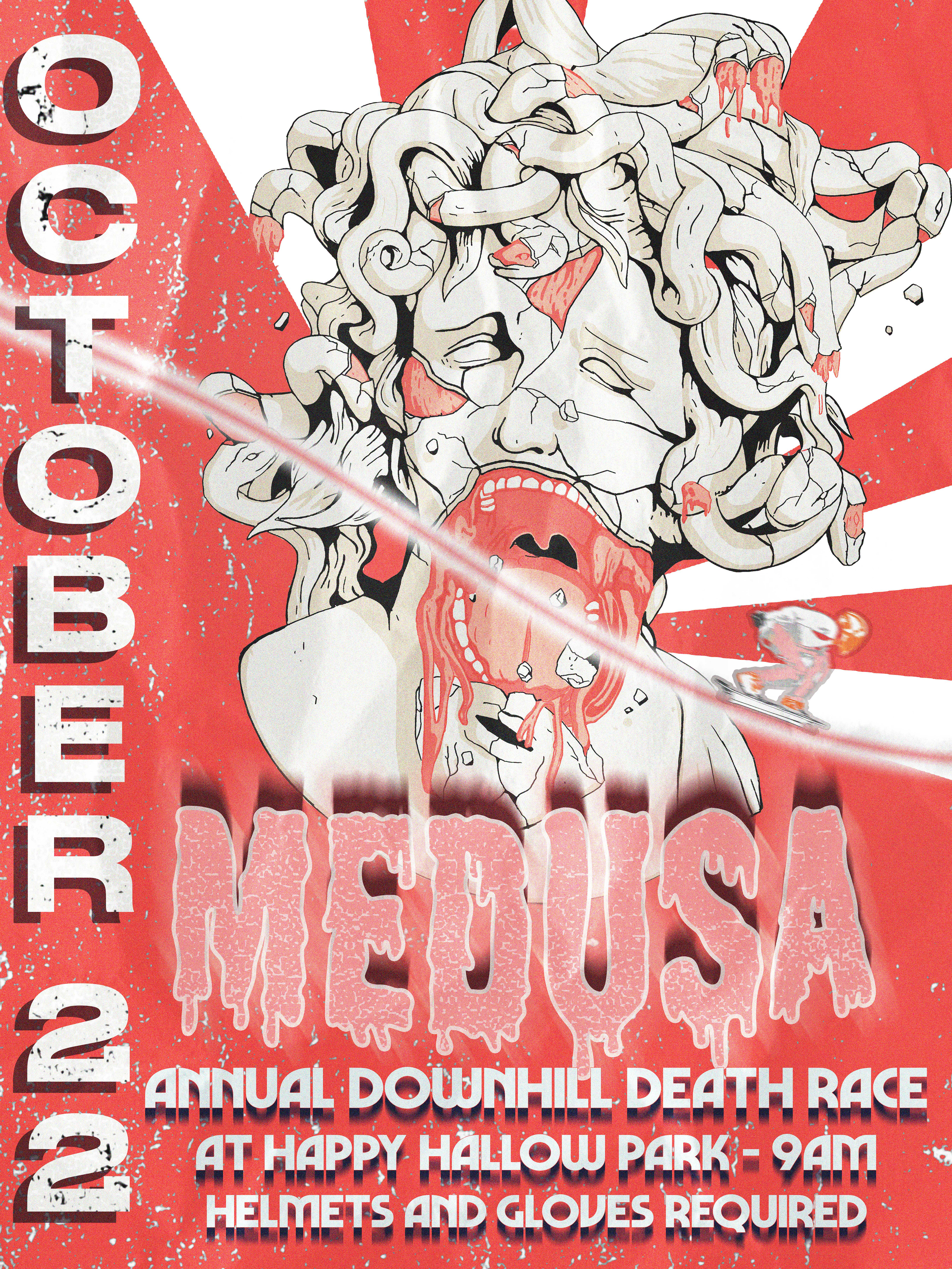 A poster for the Purdue University Longboard Club's annual "Medusa" Downhill Race. A fun and kinetic illustrative design challenge that had to stack up to client demands.