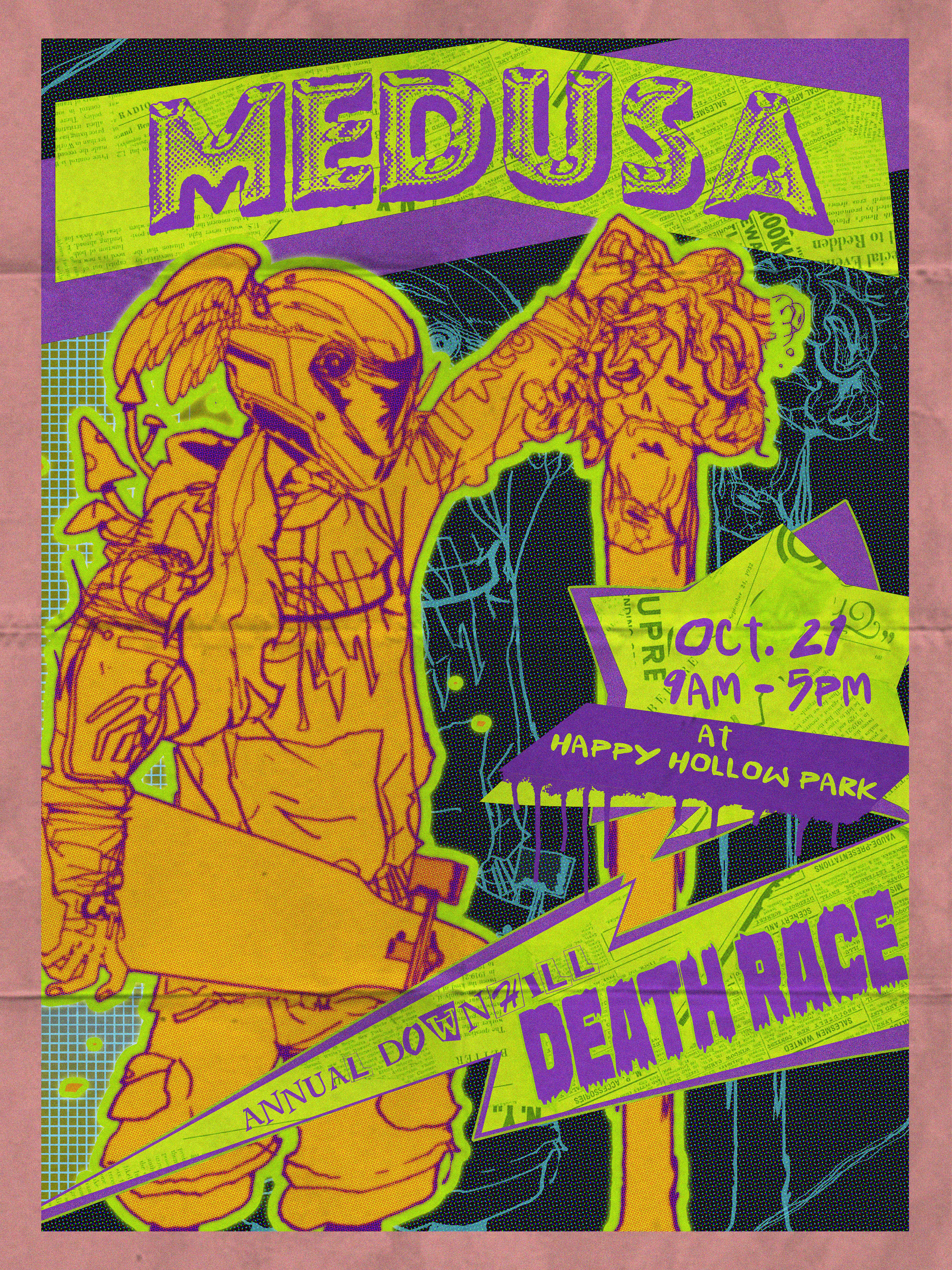 Another poster for the Purdue University Longboard Club's annual "Medusa" Downhill Race. This time the design focused on a more punk and street styled aesthetic while making reference to a particular pose that the client requested.