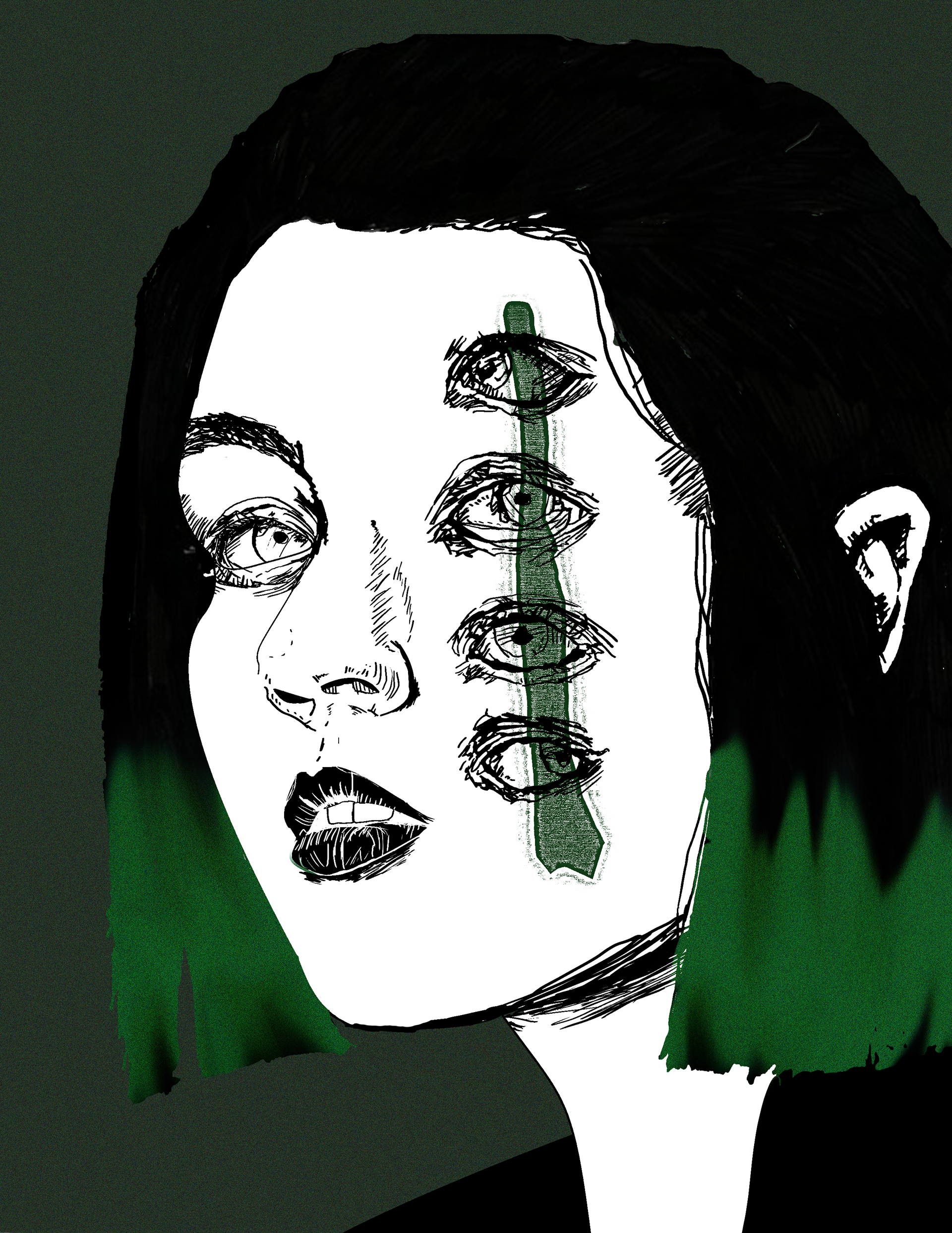 A stylized portrait of my girlfriend. The harsh linework and unsettling anatomy are inspired by famous horror mangaka Junji Ito, and an intentional appeal to her love for horror aesthetic.