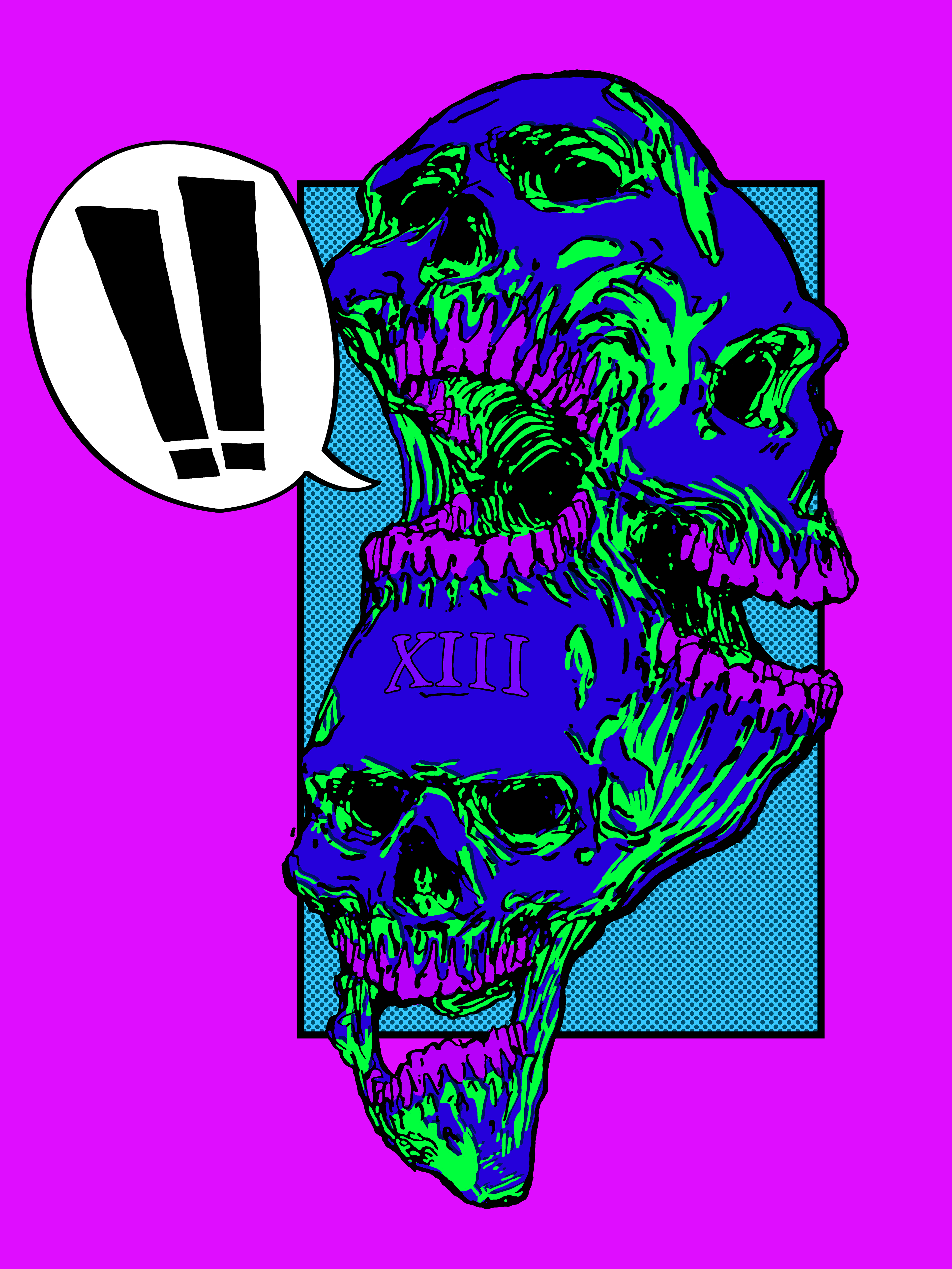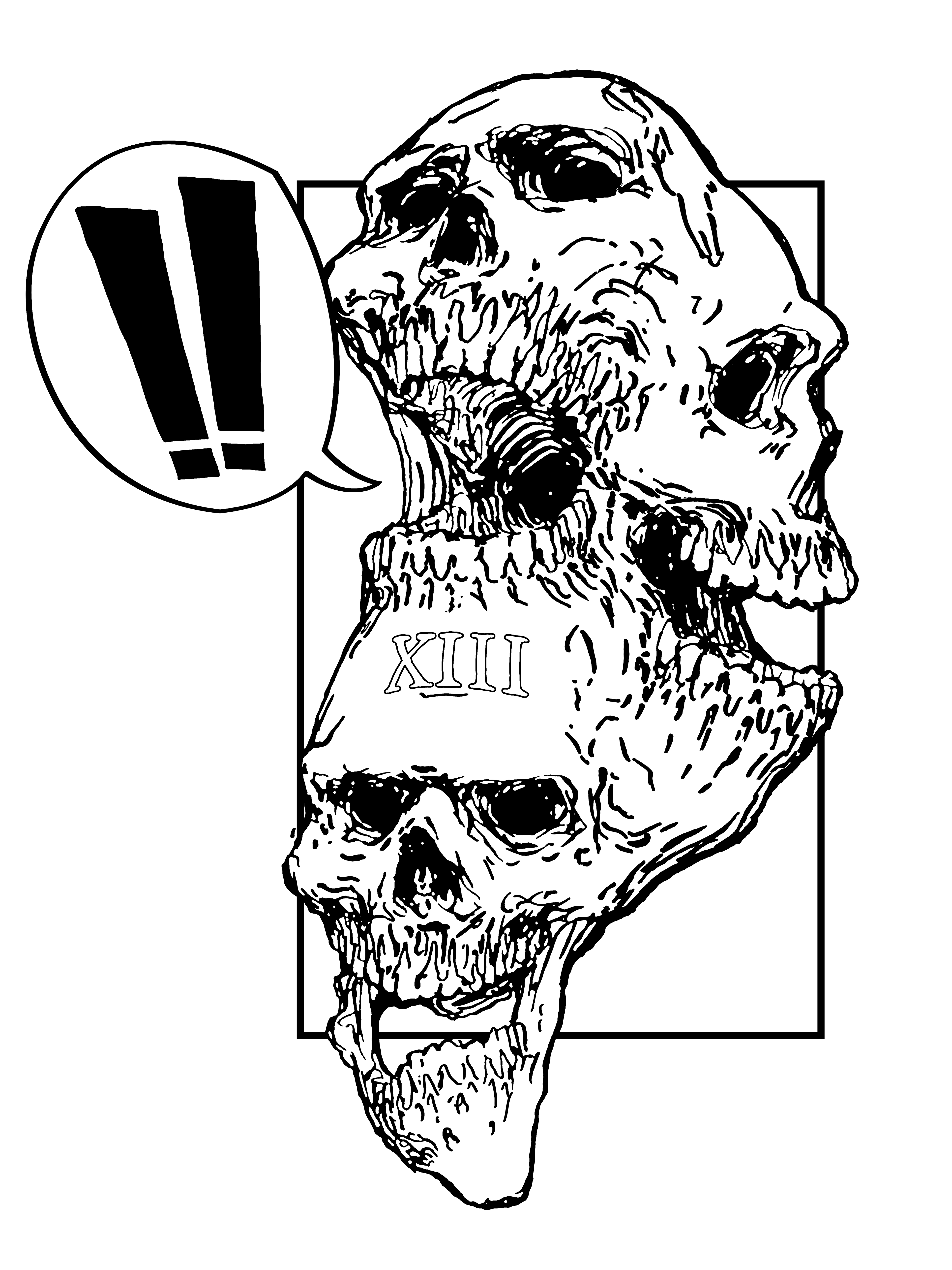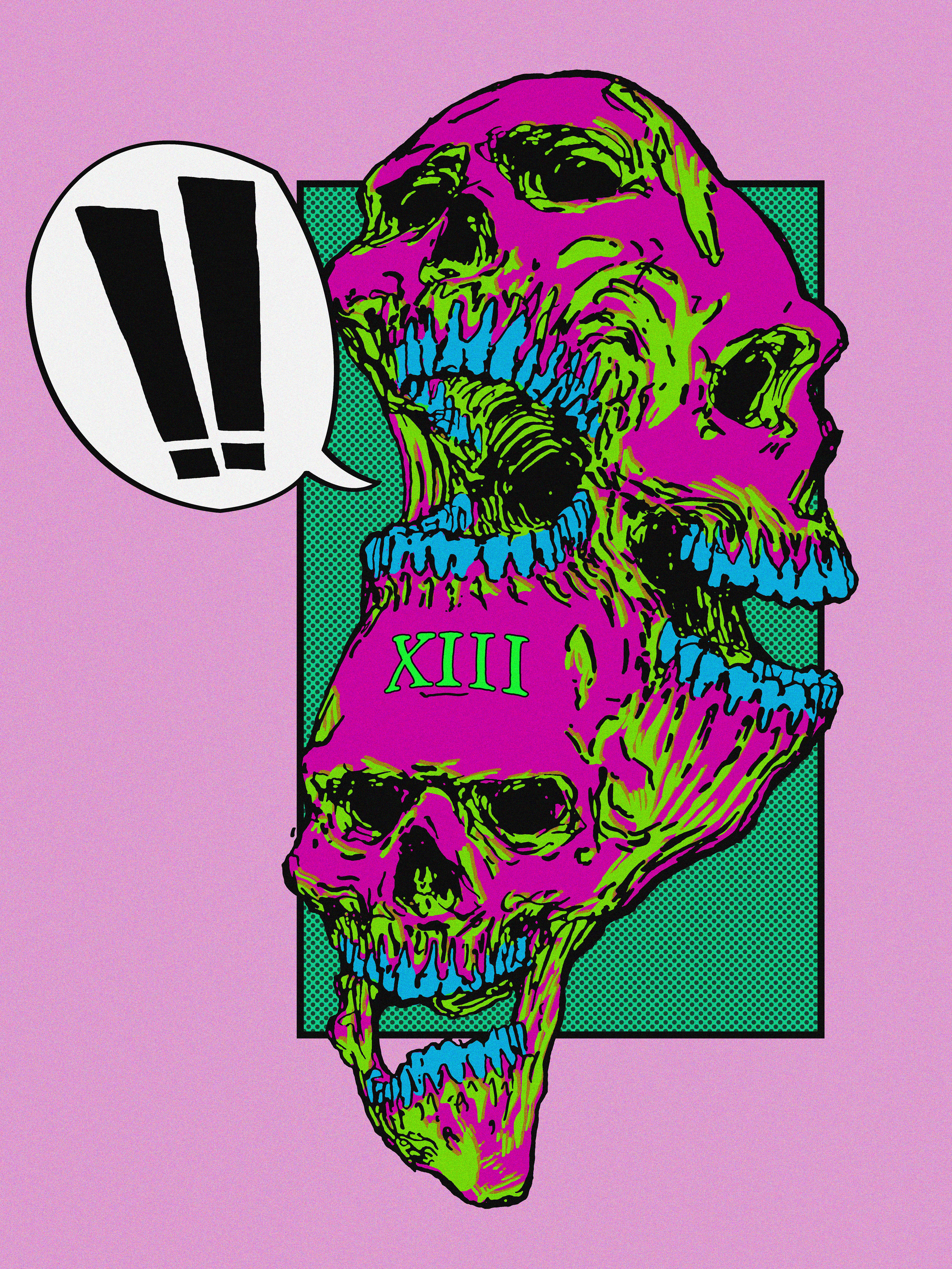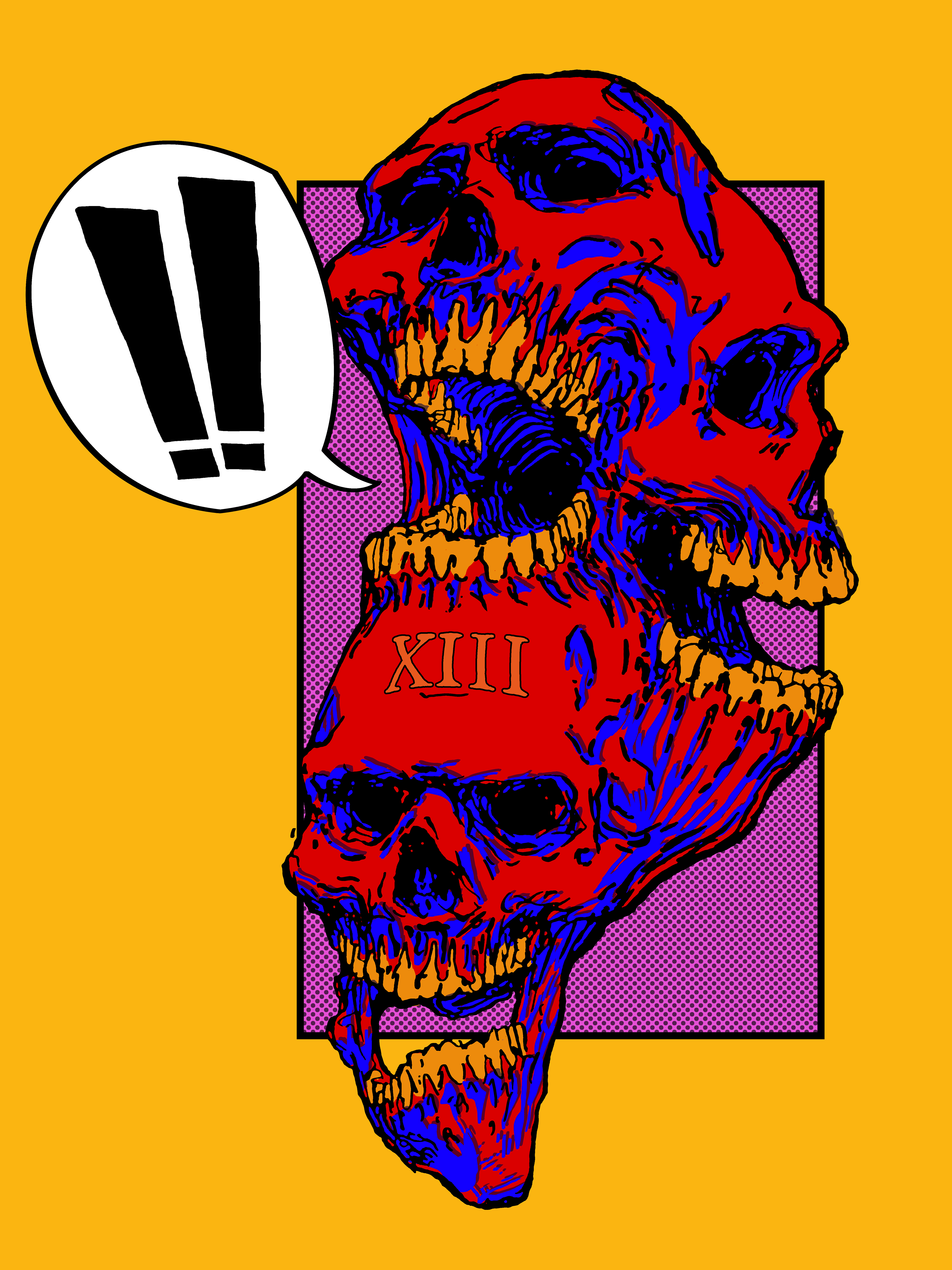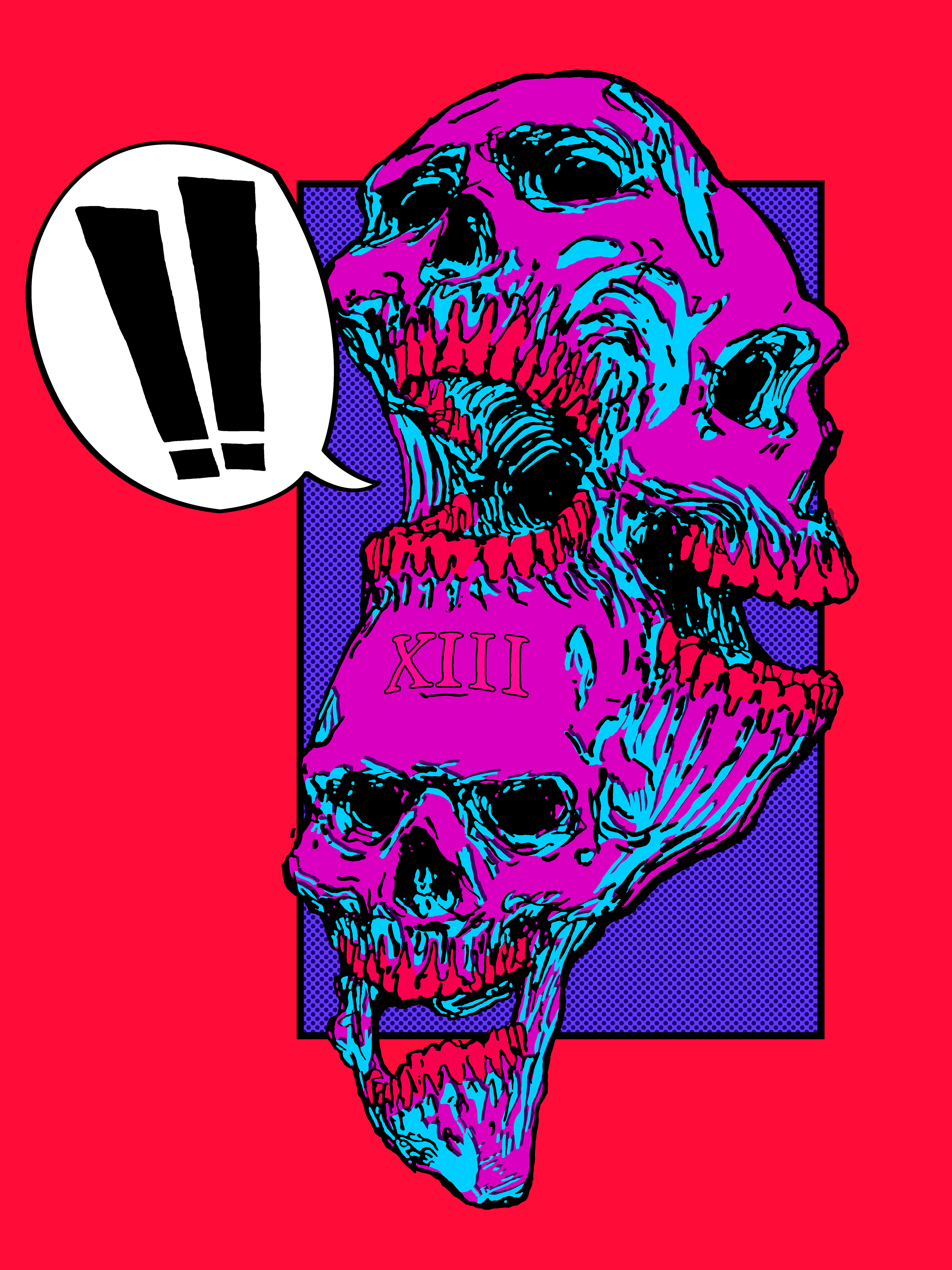 A creepy amalgamate of skulls. A mix of thick, inked-in lines, comic panel styling and several alternative colorways.